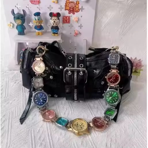 Bound in black leather and sealed with relics of time, this purse carries not only your keepsakes but the remnants of countless hours once lived and lost. Every vintage watch in its chain is a testament faces that no longer tick, yet still speak. Together, they form a covenant: a pact between mortality and eternity, stitched into something you can hold close.