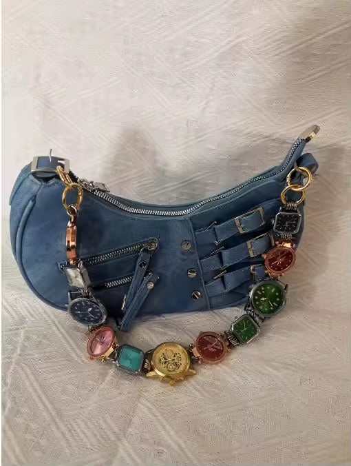 The strap is a procession of vintage watch faces, each frozen in its own shipwrecked second. Green, red, pink, and gold dials glimmer like relics dredged from the depths, a chromatic reminder that even in decay, beauty survives. Carried at your side, it becomes a reliquary of drowned memories — a treasure not salvaged, but resurrected.