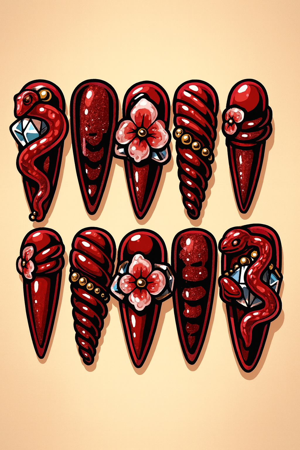 Snakes curl across the nails in ruby scales, guardians of hidden treasure. Blossoms bloom in translucent crimson, their petals veined with gold, soft against the hardened flame. Studded beads gleam like relics pressed into stone, keeping time with every gesture of the hand.