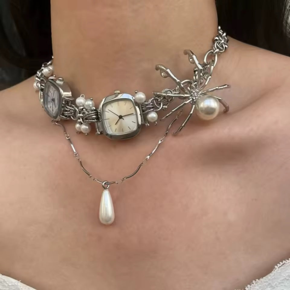 An elegant snare spun from fractured timepieces, pearls, and the gleam of silver silk. The Widow’s Hour coils around the throat like a secret vow — its frozen watches counting down to nothing, its pearl-bodied spider resting quietly against the pulse.